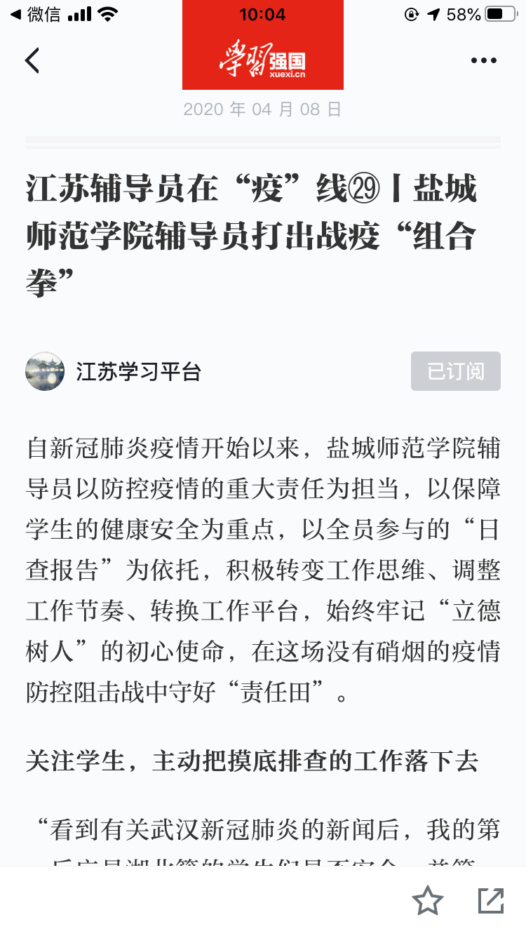 4月8日,学习强国江苏学习平台报道beat365辅导员在疫情防控时期,始终牢记“立德树人”初心使命,围绕学生,全力以赴把各项工作做实做细做到位。