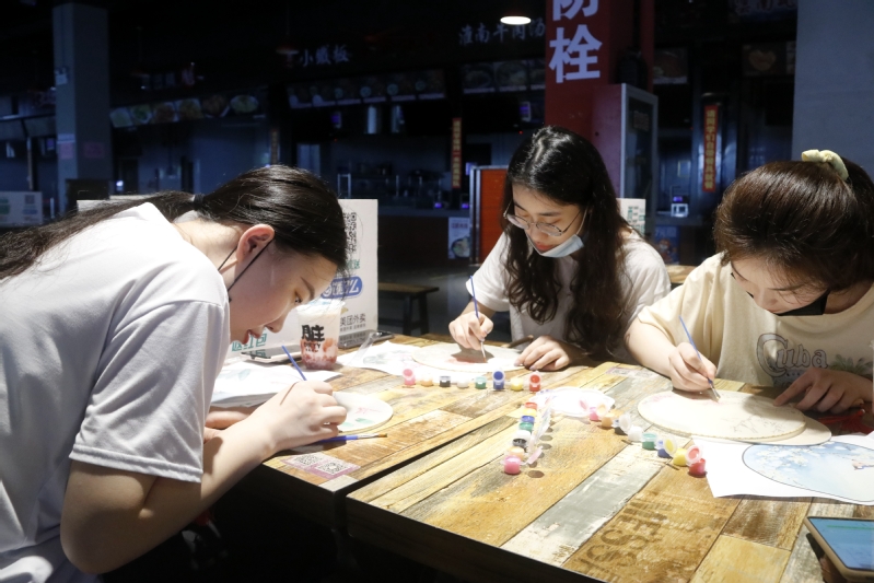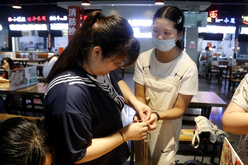 本次活动由“粽享一夏”“香蜜沉沉”“彩绳纳吉”“渲抹端阳”四个板块组成,同学们根据自己的兴趣爱好自行参与活动。首先,包粽子组的同学点燃了活动气氛,很多同学之前并没有尝试过包粽子,所以每当有同学成功包出一个粽子,现场不停地发出赞叹、惊羡声。在包粽子的同学还忙得热火朝天之时,缝制香囊的同学们已经把香囊美美地戴在身上了,淡淡的艾草清香扑鼻,飘散在每个角落。编织五彩绳和手绘团扇的同学们都是多人合作,大家不时地互相交流想法,积极探讨如何将五彩绳和团扇创作得富有新意而又不失传统文化富有的内涵。在活动快要结束之时,大家纷纷展示出自己的作品,询问创作寓意。最后,整个活动在大家的欢声笑语和收获满满中落下帷幕。