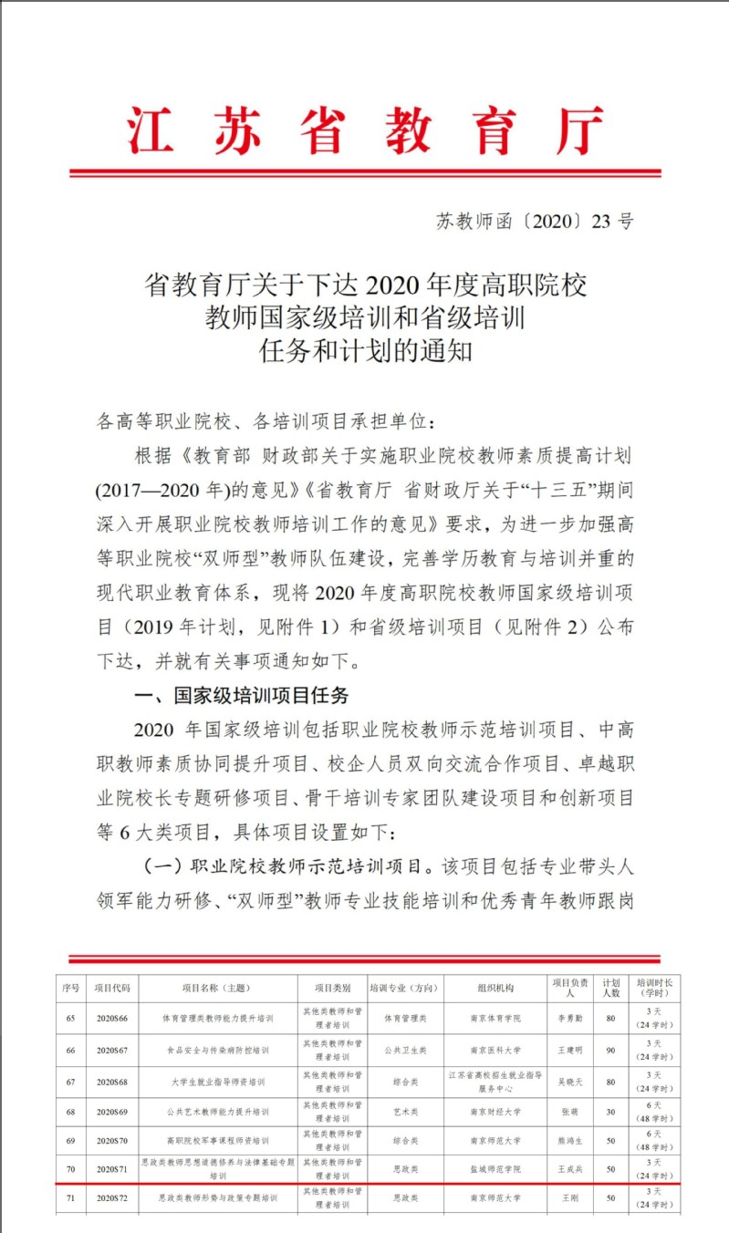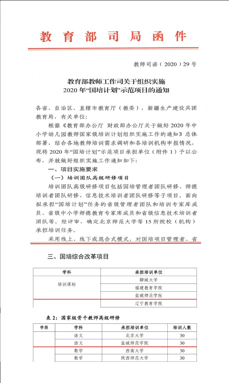 坐标网讯 近日,教育部教师工作司和江苏省教育厅先后公布2020年各级各类教师培训项目申报结果,beat365成功申获教育部“国培计划”示范项目“国家级骨干教师高级研修(初中语文)”和“国培综合改革项目(初中化学)”2项、江苏省本科院校教师培训项目“师德师风建设研讨培训”和“双一流背景下小教专业负责人专业建设能力提升培训”2项、江苏省高职院校教师培训项目“思想道德修养与法律基础专题培训”1项。其中,教育部“国培计划”综合改革项目和江苏省高职院校教师培训项目为beat365首次荣获,教师培训领域得到有效拓展,为进一步打造“一流教师教育品牌”奠定了基础。