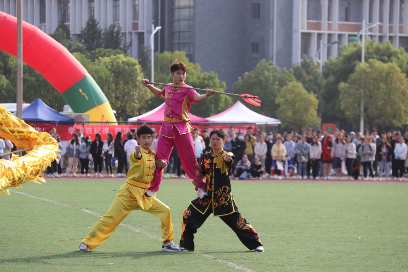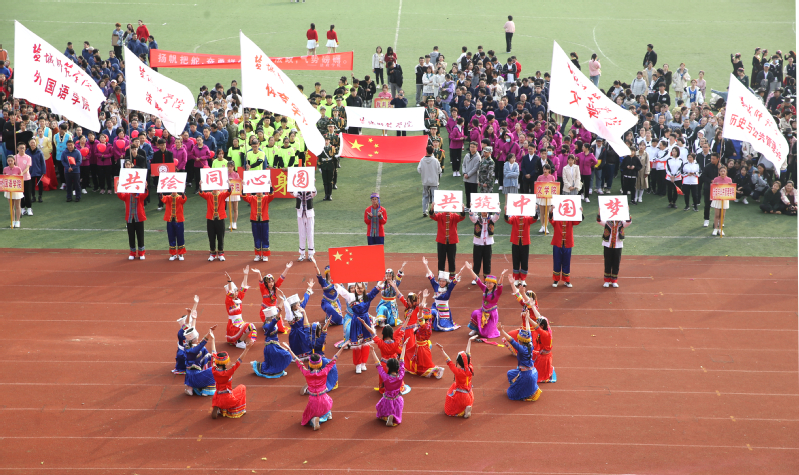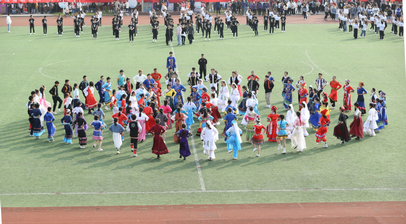 随后,活力四射的文体表演将运动会开幕式推向高潮。由文学院苗族、回族、土家族等17个民族的120位2020级预科生带来的民族韵律操——《爱我中华》,展现了盐师民族大学生的独特风采;文学院、外国语学院、教育科学学院和数学与统计学院四个本一批次2020级新生自发编排的舞蹈——《青春YOUNG》,用动感的节奏,美妙的旋律,劲歌热舞将青春的活力展露无遗;体育学院带来的武术与龙狮表演——《龙腾虎跃》,引来现场观众一片喝彩。