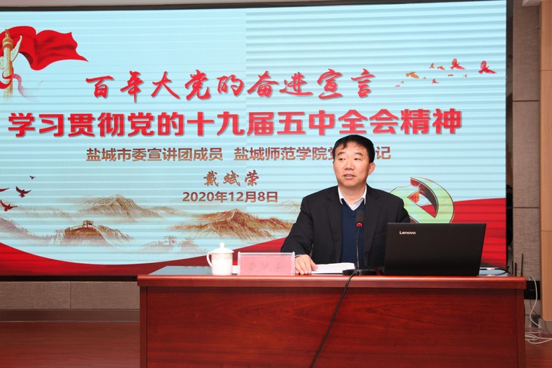 日前,盐城市委宣讲团成员、beat365党委书记戴斌荣赴建湖县和江苏医药职业学院作党的十九届五中全会精神宣讲报告。