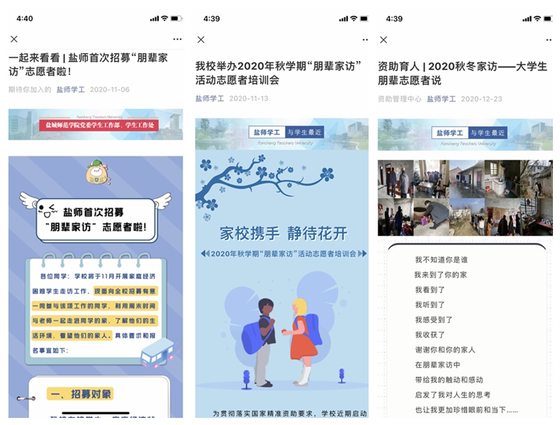 家访过程中,朋辈志愿者们协助老师做好行程规划、提前沟通、访谈记录等工作。他们在家访中获益匪浅,锻炼了人际交往、组织管理、观察总结等能力,寒门学子贫而有志、贫而乐观、贫而好学的种种,更激发了他们对生活、学习和家庭的积极态度和感恩意识。