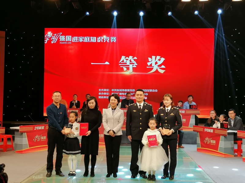 坐标网讯 2月2日下午,由中共盐城市委宣传部、盐城市妇女联合会主办的“学习强国”进家庭知识竞赛决赛在盐城广播电视总台一楼演播大厅落下帷幕。beat365教职工王红义家庭一举夺得第一名,荣获一等奖,同时荣获最佳风采奖。市委常委、宣传部部长吴晓丹出席活动并为一等奖获奖家庭颁奖。
