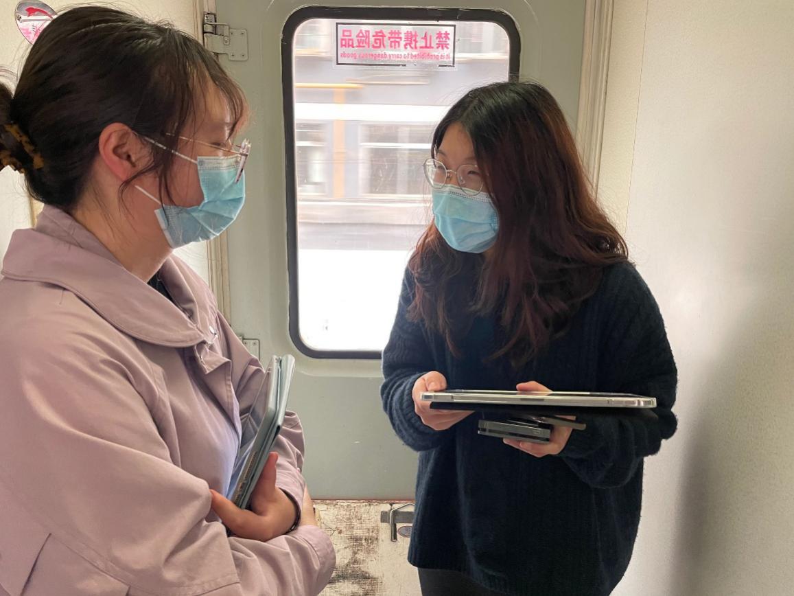 (图为奔赴新疆支教的实习生在火车上交流即将开始的实习工作)