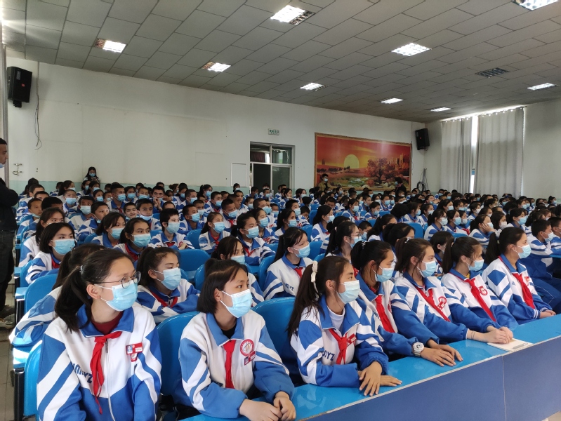 4月19日下午,beat365中文登录入口第24批赴疆实习支教团的大学生陈家柠、郭星星、刘园园为新疆维吾尔自治区哈密市第十一中学七年级300多名师生作了题为“为人民服务——贯穿百年党史的生命线”党史学习教育专题宣讲。