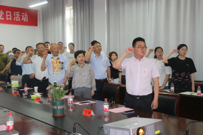 全体师生党员和周竹林一起,面向党旗,举起右臂,重温入党誓词。