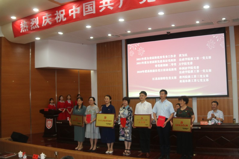 党委副书记于建江宣读了省相关表彰决定。黄为民同志被评为2021年度全省高校优秀党务工作者,法政学院教工第一党支部被评为2021年度全省高校先进基层党组织,文学院党委获2019-2020年度江苏省高校“党建工作创新”二等奖,外国语学院党委、法政学院教工第一党支部获2019-2020年度江苏省高校“最佳党日活动优胜奖”。教育科学学院教工第三党支部、离退休教工第七党支部被评为2020年度江苏省高校“特色党支部”。