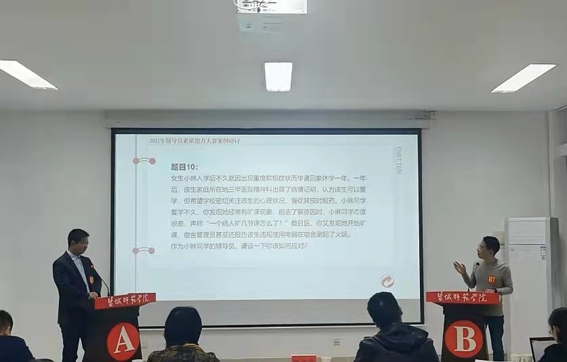 本次案例研讨比赛对标国赛新赛制,采用“你提问,我回答”的形式,采取“AB角随机组合”,每两名选手为一组,围绕抽取案例共同辨析方式进行,主要考察辅导员综合运用理论分析问题、研判问题、解决问题的能力。