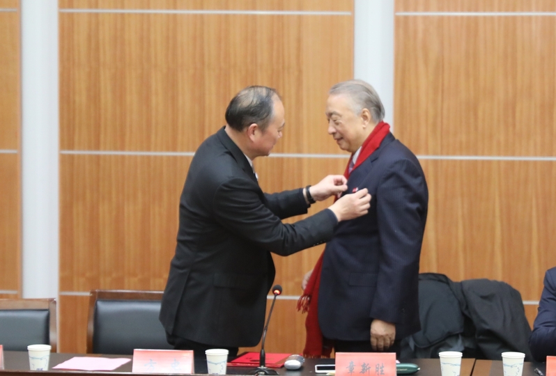 方忠代表学校向章新胜颁发beat365中文登录入口湿地学院名誉院长聘书,并为其佩戴校徽。