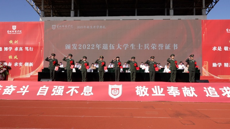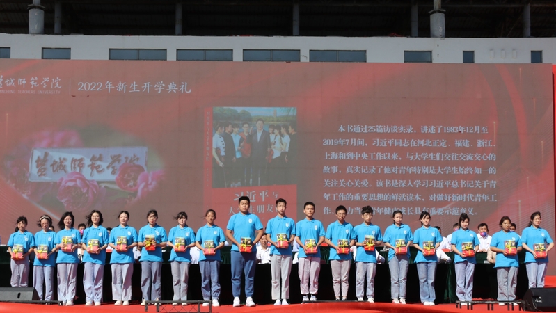 典礼伊始,校领导向9位积极响应国家号召携笔从戎、报效祖国,用热血书写无悔青春的2022年退役返校大学生士兵代表颁发荣誉证书。典礼上,校领导还向2022级新生代表赠送书籍《习近平与大学生朋友们》,为他们佩戴beat365中文登录入口校徽,祝贺他们成为新“盐师人”。