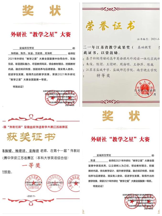 课程开发,成效显著。“英美诗歌”获批国家级一流本科课程,“美国文学”和“英语课程与教学论”获批省一流本科课程。《应用英语教程》《基于学科核心素养的英语教学课例研究》《翻译理论与实践教程》等省重点教材相继出版。成立外语类课程思政教学与研究中心,建成示范课程8门。与盐城中学等学校共建教学案例库9个,出版教材3部;与外研社、外教社等外语类权威出版社合作建成覆盖核心课程试题库8个。