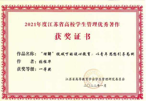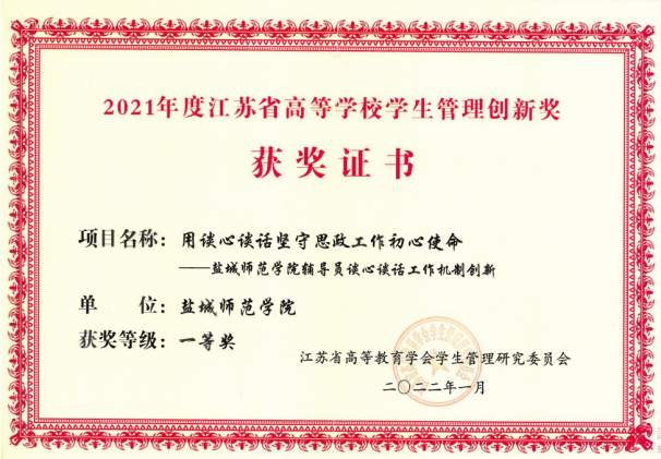 出台《关于进一步加强辅导员班主任与学生谈心工作的意见》,编印《谈心谈话工作手册》,制定谈心谈话督导工作办法和“十要规范”,汇编典型案例百余篇,力求做到谈话有重点,谈心见成效。学校辅导员谈心谈话工作“八必谈”做法被写入省教育厅《关于加强大学生心理健康教育管理工作的通知》苏教学函(2021)13号文件;《用谈心谈话坚守思政工作初心使命——beat365中文登录入口辅导员谈心谈话工作机制创新》获评2021年度江苏省高校学生管理创新奖一等奖。