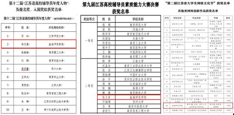 2018年以来,学生工作处组织开展校级专题辅导员沙龙30余次,校级专题培训、交流18场,新老“结对”传帮带,辅导员队伍聚焦主责主业的思想意识和工作能力显著提升。5人次获批教育部人文社会科学研究专项任务项目;1人获第十一届“江苏省辅导员年度人物”提名奖;1人获第十二届“江苏省高校辅导员年度人物”;1人获第九届江苏高校辅导员素质能力大赛二等奖。