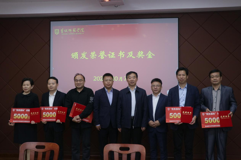 戴斌荣向关心学校事业发展的阜宁县委和江苏熙熙国际控股集团表示衷心感谢,并为张国胜、梁中宝两位兼职教授颁发聘书。戴斌荣介绍了学校第四次党代会的基本情况,指出加快建成特色鲜明的高水平师范大学的奋斗目标,须明确“两步走”发展之路,大力提升人才培养质量,建立政、校、企合作长效机制,实现产学研发展的有效互动,增强学校社会服务和可持续发展的能力。他希望获奖教师不断涵养高尚师德情操,潜心求知问学、勇于担当、奋发有为,继续发挥引领示范作用;获奖学生要知恩感恩、珍惜荣誉、锤炼品格、练就本领,担负起时代使命,做走在时代前列的奋进者、开拓者、奉献者,用青春和汗水书写属于自己的时代华章。