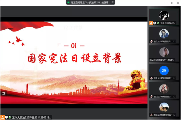 此次活动由法政学院“大学生法治宣讲团”成员为全校师生进行宪法知识与党的二十大精神的宣讲,将宪法精神与青年责任联系起来,呼吁同学们自觉遵守宪法,以实际行动践行宪法精神。活动同时邀请了法政学院教师线上进行普法和法律援助,为大家答疑解惑。线上普法是法政学院在疫情防控期间落实普法宣传的一项创新举措,既提高了同学们运用法律维护自身权益、化解矛盾纠纷的能力和水平,又有效避免了人员聚集带来的疫情防控风险,实现了疫情防控和普法宣传“两手抓,两不误”。