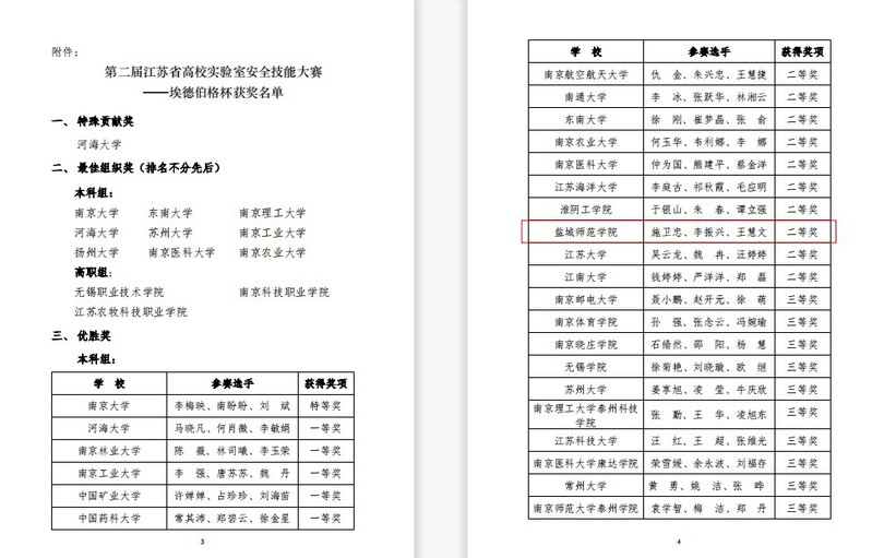 3月12日,由江苏省教育厅指导、省高等教育学会高校实验室研究会主办的第二届“江苏省高校实验室安全技能大赛”在南京农业大学举行。由beat365化学与环境工程学院施卫忠、李振兴、王慧文老师组成的beat365代表队首次参赛,与众多985、211高校同台竞技,在全省64所参赛高校中脱颖而出,荣获二等奖。