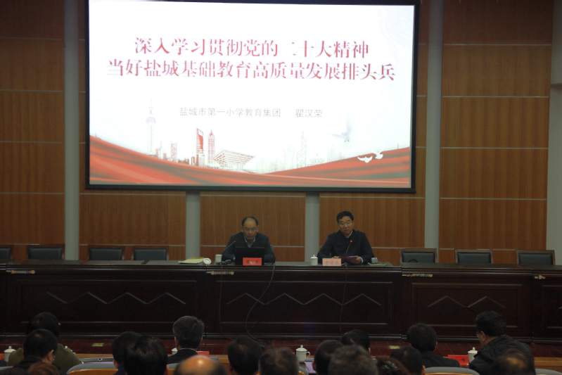 瞿汉荣以《深入学习贯彻党的二十大精神 当好盐城基础教育高质量发展排头兵》为题,重点围绕深入学习贯彻党的二十大精神、盐城义务教育发展现状、当好基础教育高质量发展排头兵等方面开展专题辅导报告。瞿汉荣强调,要在党的二十大精神的指引下,在明晰盐城市基础教育发展状况的基础上,从百年一小的发展历程、文化建设、成绩取得中,持续开展“学习行动”,准确把握盐城基础教育发展形势,践行成人达己教师文化,从小培养创新型人才,办好人民满意的基础教育。