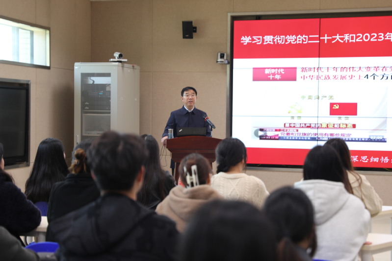 3月31日下午,学校党委书记戴斌荣走进思政课堂,以“学习贯彻党的二十大和2023年全国两会精神 立志做新时代好青年”为主题,为学生上了一堂精彩生动的思政第一课。