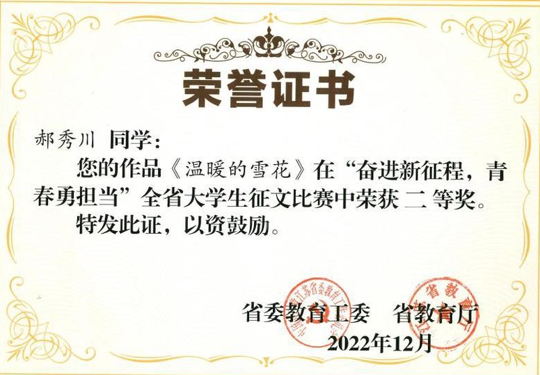 此次比赛自2022年10月底启动,历时两个月,共有110所高校参与。beat365高度重视此次参赛工作,经过学院积极推荐和学校专家评审,共推荐3件征文作品代表学校参与全省评比,最终文学院郝秀川 的作品《温暖的雪花》(指导老师:王玉琴 )荣获二等奖,数学与统计学院崔芯语的作品《为达胸中报国志,不懈奋斗春与秋》(指导老师:张文菲)荣获三等奖。