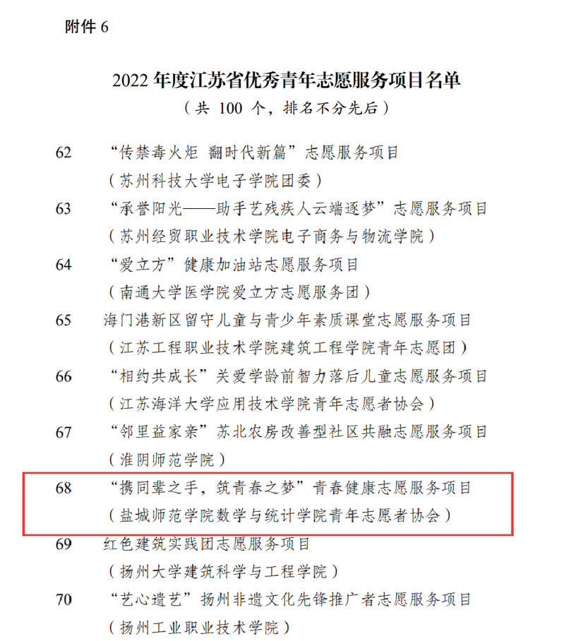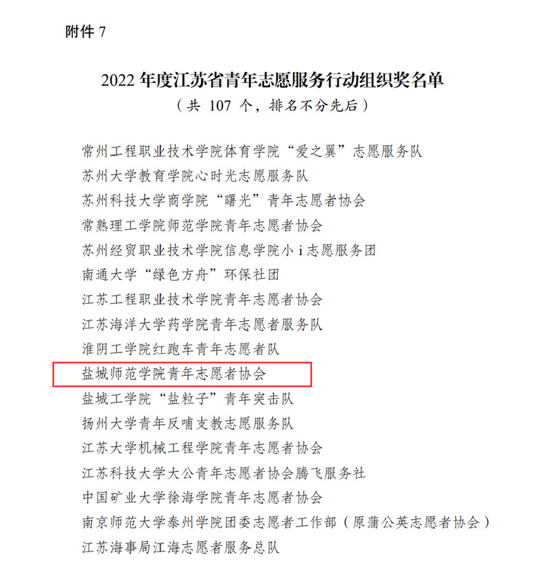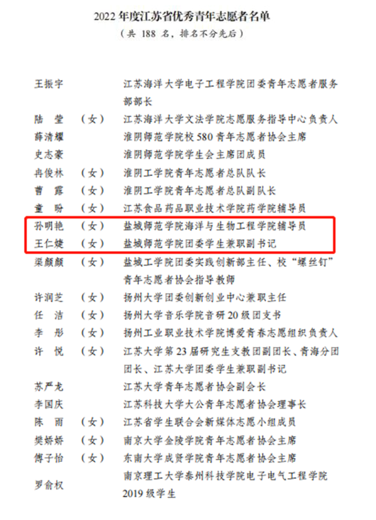 近日,共青团江苏省委、江苏省青年志愿者协会表彰了2022年度全省青年志愿者行动。beat365“携同辈之手,筑青春之梦”青春健康志愿服务项目获“2022年度江苏省优秀青年志愿服务项目”称号。beat365中文登录入口青年志愿者协会获“2022年度江苏省青年志愿服务行动组织奖”。校团委副书记张旺获“2022年度江苏省青年志愿服务事业贡献奖”称号。海洋与生物工程学院孙明艳老师、外国语学院王仁婕同学获“2022年度江苏省优秀青年志愿者”称号。