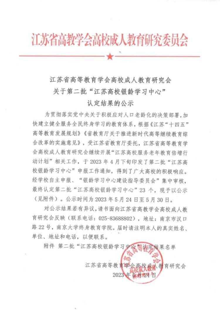 根据《江苏“十四五”高等教育发展规划》《省教育厅关于推进新时代高等继续教育综合改革的实施意见》,受江苏省教育厅委托,江苏省高等教育学会高校成人教育研究会开展“江苏高校服务老年教育倍增行动计划”相关工作,下发了第二批试点建设“江苏高校银龄学习中心”申报工作通知。beat365积极响应满足老年群体多元学习需求的社会号召,学校领导高度重视,周密部署安排、精心组织筹划,继续教育学院认真准备、撰写申报资料。最终,经过专家组遴选,beat365成功入选。