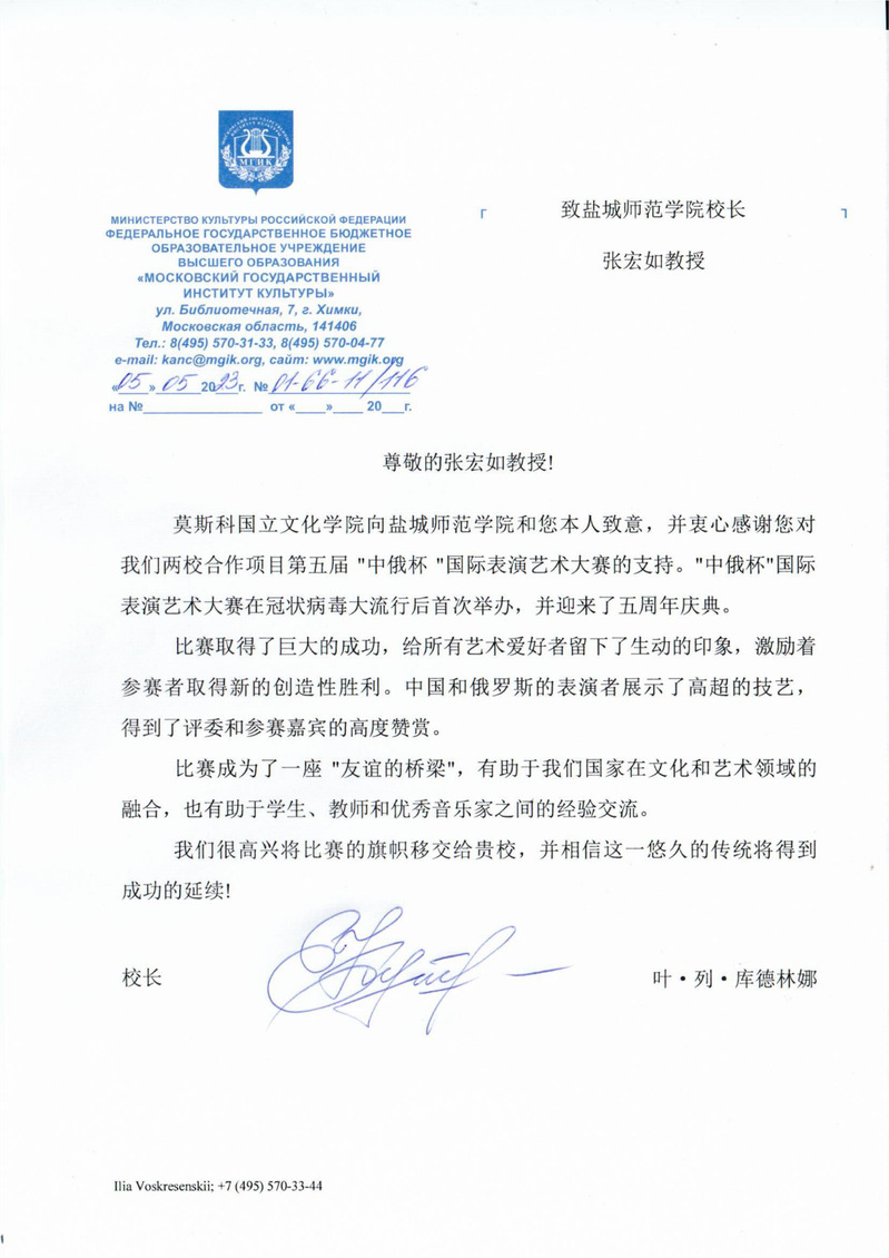 近日,beat365与莫斯科国立文化学院联合举办的“中俄杯”国际声乐、钢琴、小提琴大赛在莫斯科国立文化学院音乐厅举行。本次大赛以视频参赛和现场参赛两种方式进行。学校党委副书记、校长张宏如以视频方式为开幕式致辞。