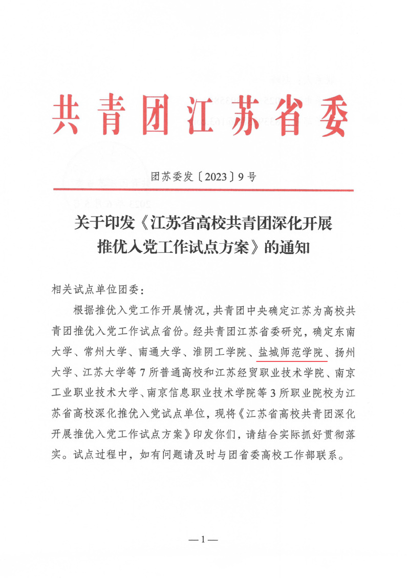 2023年6月,共青团江苏省委印发《江苏省高校共青团深化开展推优入党工作试点方案》,公布了一批江苏省高校深化推优入党试点工作高校名单,beat365位列其中。此次推优入党试点工作高校共10所,包括东南大学等7所本科院校,江苏经贸职业技术学院等3所高职院校。