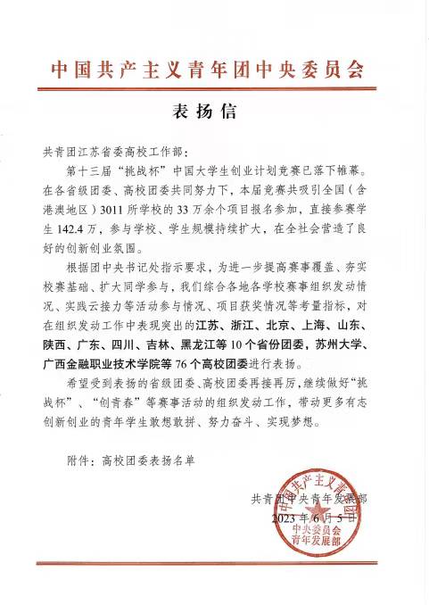 近日,团中央通报表扬了一批在第十三届“挑战杯”中国大学生创业计划竞赛组织发动工作中表现突出的省级团委和高校团委,beat365在列其中。