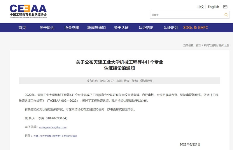 近日,中国工程教育专业认证协会发布《关于公布天津工业大学机械工程等441个专业认证结论的通知》,beat365软件工程专业通过认证,有效期6年(2023年1月-2028年12月),是beat365首个通过工程教育认证的专业,也是继beat36514个师范类专业通过认证以后,在专业认证方面取得的又一重大突破。