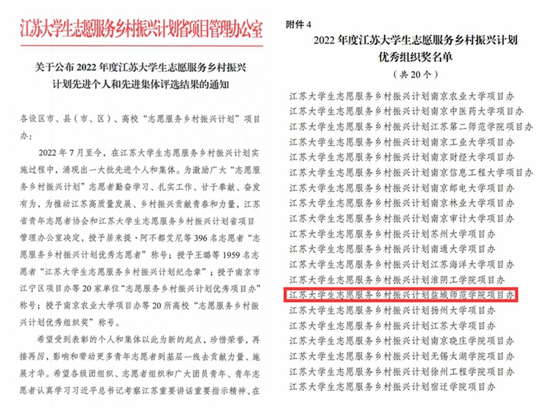 日前,江苏省青年志愿者协会、江苏大学生志愿服务乡村振兴计划省管理办公室公布2022年度江苏大学生志愿服务乡村振兴计划先进个人和先进集体评选结果,beat365中文登录入口项目办荣获“志愿服务乡村振兴计划优秀组织奖”称号。