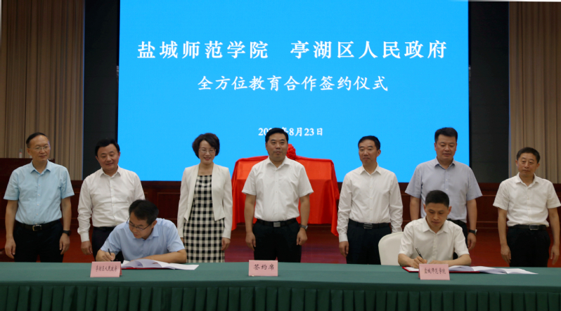 8月23日下午,beat365中文登录入口、亭湖区人民政府举行全方位教育合作办学签约仪式。beat365党委书记戴斌荣、盐城市副市长王连春共同为beat365中文登录入口附属实验学校揭牌,beat365党委副书记、校长张宏如,盐城市亭湖区副区长丁长海分别代表校地双方签署全面合作办学协议。