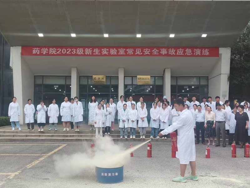 演练中,指导老师带领学生熟悉实验室水电开关位置、防护设施使用方法以及紧急逃生路线,讲解自救互救、快速逃生的基本方法,开展腐蚀性化学品溅入眼中的应急淋洗和烘箱故障导致温度失控的逃生现场演练。此外,药学院实验室管理人员还详细讲解了干粉灭火器的使用范围和正确用法,并组织学生现场开展了灭火器使用的操控演练。整个演练过程有条不紊,紧张有序,达到了预期目的。