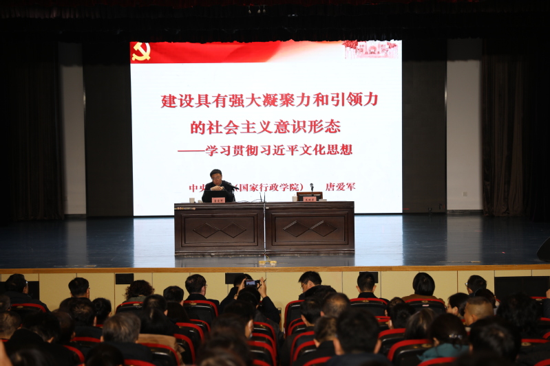 唐爱军以《建设具有强大凝聚力和引领力的社会主义意识形态——学习贯彻习近平文化思想》为主题,从意识形态工作的极端重要性、当前意识形态领域面临的风险挑战、做好意识形态工作的基本思路等三个方面展开论述。他指出,当前做好意识形态工作,必须牢牢掌握马克思主义理论建构权、掌握社会主义意识形态话语主导权、掌握意识形态工作管理权。