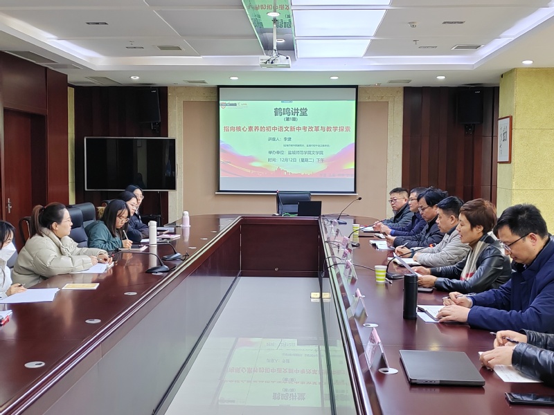 文学院初中语文学科研究组以“三个一”活动为契机在附属实验学校举办首期“鹤鸣讲堂”。文学院校友、盐城市教科院副院长、初中语文教研员李建详细解读了指向核心素养的初中语文新中考改革与教学探索,重点分析了课标背景下语文中考改革的最新方向及其对教学实践的影响,对从事一线语文教学和研究的老师具有重要指导意义。