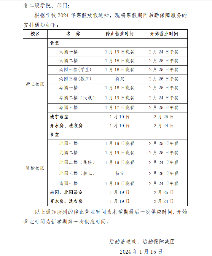 关于2024年寒假后勤保障服务安排的通知