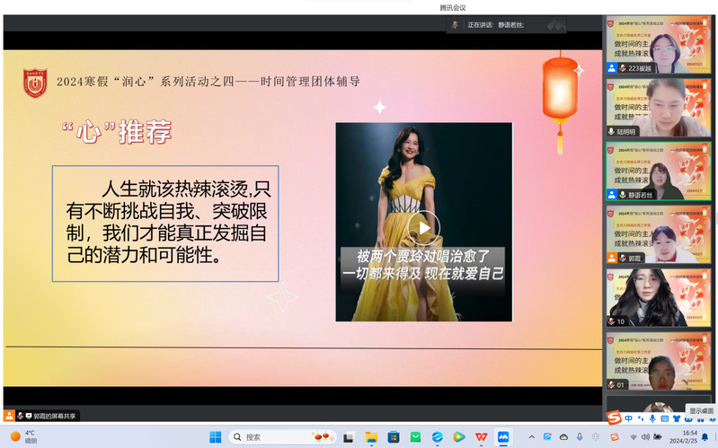 “你还记得放假的计划吗?计划是什么呢?”“提起假期计划你的内心计划是什么呢”“导致这种感受的原因是什么呢”2月25日,在以“做时间的主人,成就热辣滚烫人生”主题活动前,同学们通过slido分享了自己带着情绪感悟的假期计划。针对调研“问题”,工作室成员运用时间流水账、时间馅饼图、生命线等维度,一步步引导同学们梳理时间;播放视频《人生从一岁到一百岁的美》《两个贾玲的对话》,提升同学们对时间价值感和效能感的认知,挖掘解决时间管理的现实策略,做时间的主人,成就热辣滚烫人生。