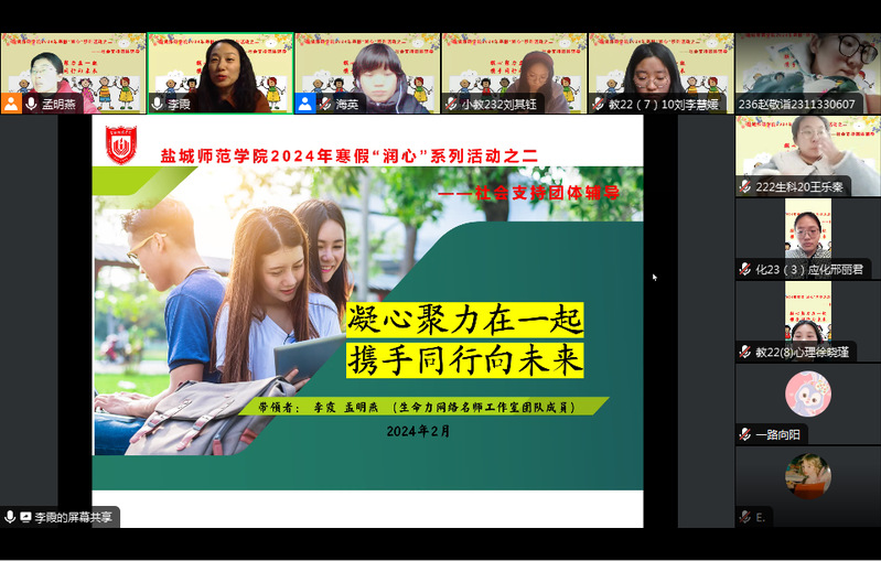 在2月22日举行的以“凝心聚力在一起,携手同行向未来”为主题的社会支持团体线上心理辅导中,工作室成员带领60名线上参与者深入了解自己的社会支持系统,掌握如何在别人需要的时候利用好、维护好自己的社会支持系统,促进心理健康,提升主观幸福感。