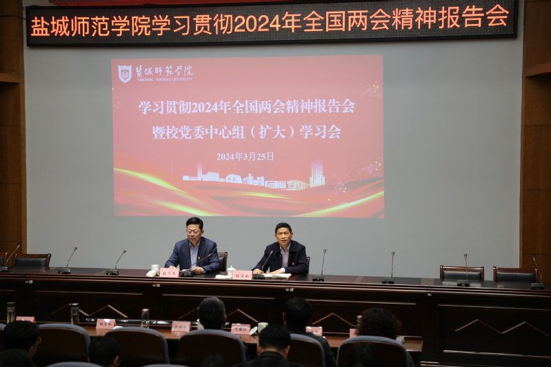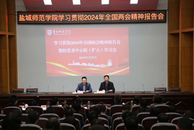 3月25日下午,beat365召开学习贯彻2024年全国两会精神报告会暨党委理论学习中心组(扩大)学习会。学校党委书记戴斌荣主持会议,全体在盐校领导出席报告会。全国人大代表、江苏悦达集团党委书记、董事长张乃文作专题辅导报告。