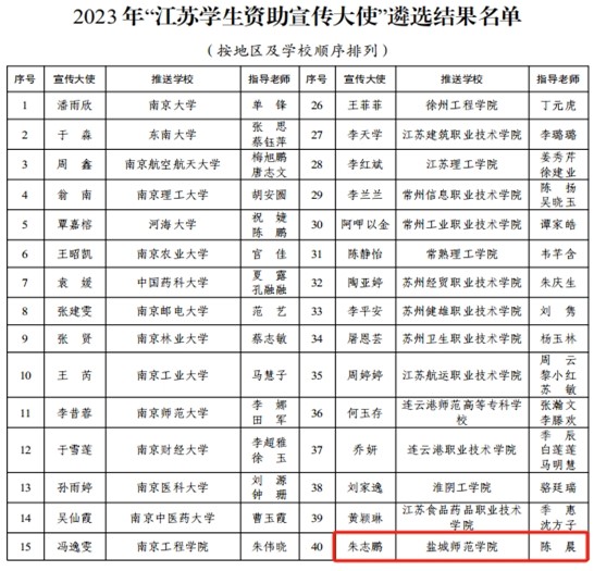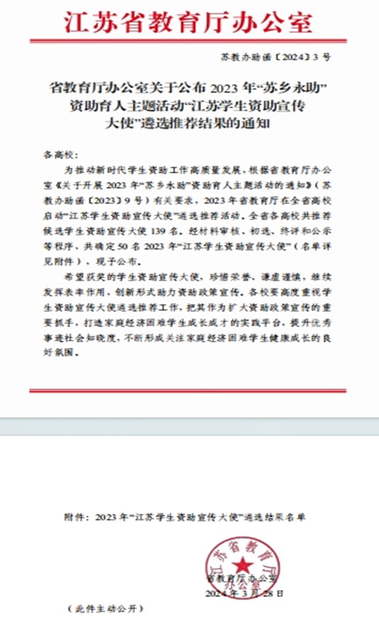 近日,江苏省教育厅公布2023年“苏乡永助”资助育人主题活动评选结果,beat365海洋与生物工程学院朱志鹏同学荣获“江苏学生资助宣传大使”称号,这是beat365学子首次获此殊荣。