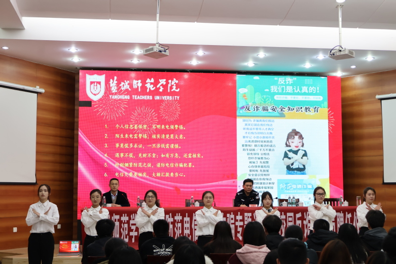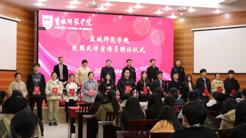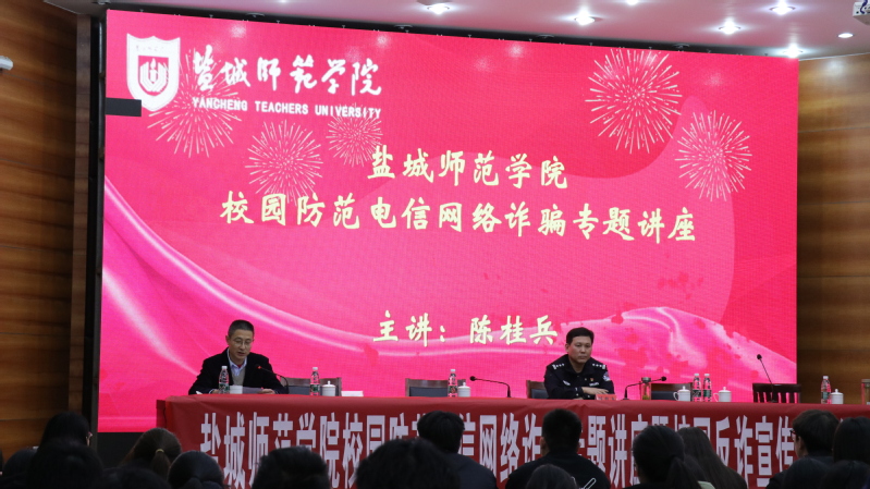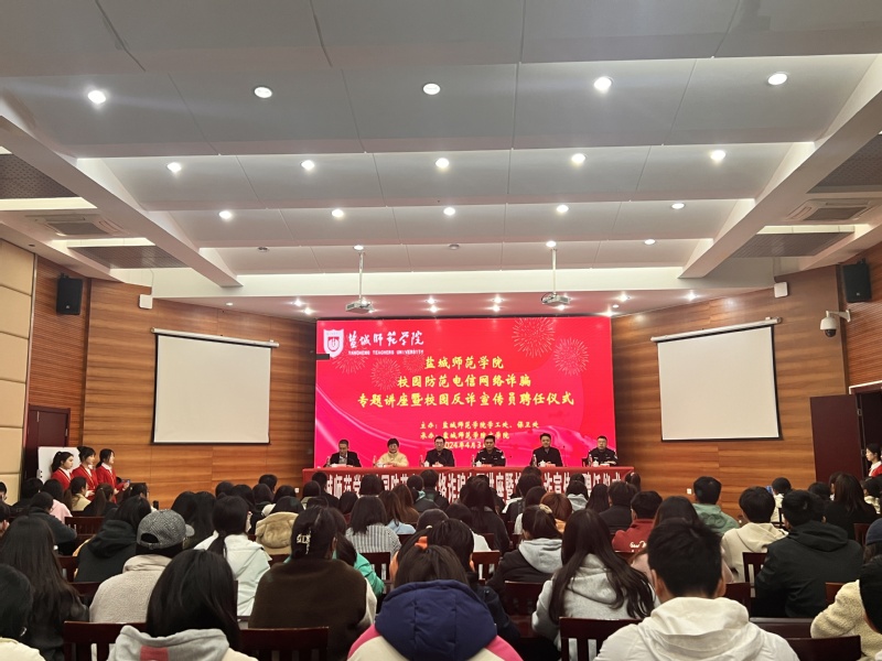 为进一步增强学生安全意识,提高防范电信网络诈骗能力,保护学生财产安全,4月3日下午,学校保卫处、学生工作处联合文学院在通榆校区南苑国培中心举办校园防范电信网络诈骗专题讲座暨校园反诈宣传员聘任仪式。学校党委常委、副校长庞波,盐城市公安局亭湖分局大洋派出所所长陈桂兵、警长刘亮出席活动。