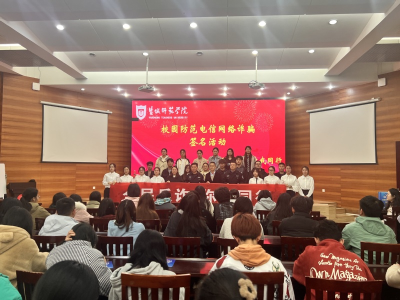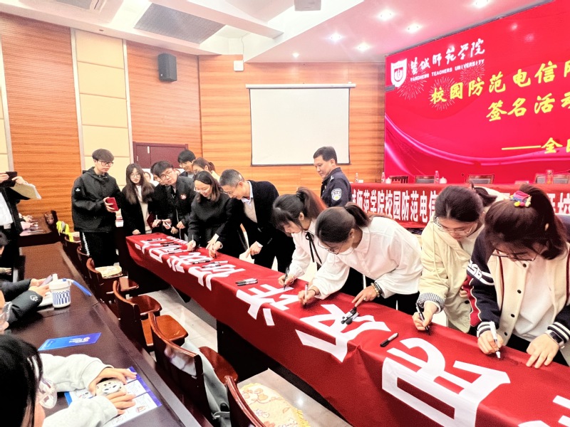 活动中,与会嘉宾共同为校园反诈宣传员颁发聘书。文学院反诈志愿者精心准备了生动有趣的反诈安全知识手势舞。广大师生在“全民反诈,你我同行”的横幅上郑重签名。