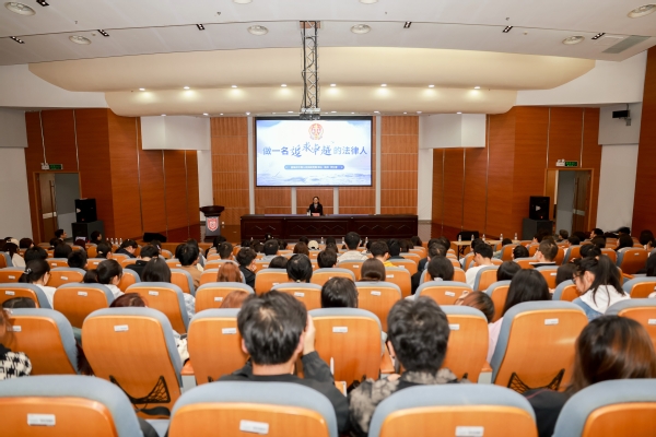 聘任仪式之后,李江蓉为师生作题为《做一名追求卓越的法律人》的讲座,法学院党总支副书记、院长朱广东主持讲座。李江蓉结合在法院的工作经历、审判工作经验和典型案例展开分享,希望法学学子成为坚守法治信仰的践行者、培塑高尚品格的示范者、实现公平正义的捍卫者、持之以恒学习的奋斗者。