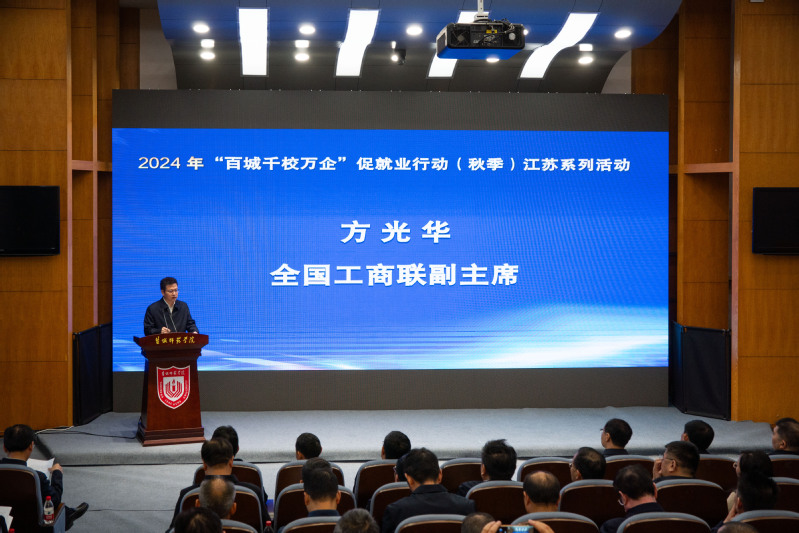 方光华副主席讲话。他指出,就业事关人民群众切身利益,事关经济社会健康发展,事关国家长治久安。“百城千校万企”促就业行动活动是落实党的二十届三中全会精神和习近平总书记对“民企高校携手促就业行动”重要指示精神的具体举措,具有重要的意义。江苏省“百城千校万企”行动,引导民营企业积极履行社会责任,助力本省高校毕业生等青年群体高质量充分就业,各项工作取得了很好的成效。方光华副主席强调,要进一步提高站位,切实增强责任感使命感。坚持依靠发展促进就业,积极培育就业扩容提质新动能。要拓宽高校毕业生等青年就业人才渠道,为校企合作、产教融合搭建新的平台。不断丰富高校毕业生职业技能培训途径。他要求要坚持问题导向,进一步梳理总结经验,务实谋划,积极开创高校毕业生、青年群体高质量就业的新模式、新途径、新局面。同时他希望江苏继续打造标杆品牌,探索先进经验,为“百城千校万企”促就业行动提质增效作出积极贡献。