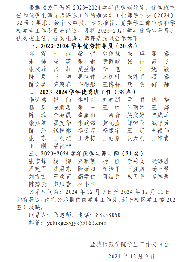 关于2023-2024学年优秀辅导员、优秀班主任、优秀生涯导师评选结果公示