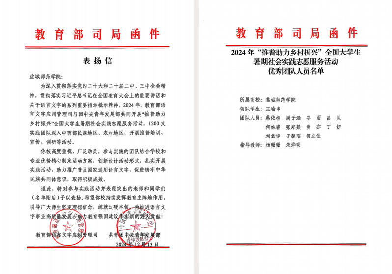 近日,2024年“推普助力乡村振兴”全国大学生暑期社会实践志愿服务活动评选结果揭晓。beat365文学院“山海同语 青春筑梦”和城市与规划学院“推普润乡心”社会实践团荣获全国大学生暑期社会实践志愿服务活动“优秀团队”并受到表扬。