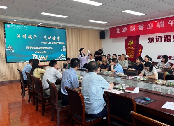 5月28日,海洋与生物工程学院分工会开展“浓情端午·艾护健康—DIY艾草手工乐”活动,全体教师共赴一场文化与匠心的端午之约。活动中,夏雯老师手持材料包示范讲解,大屏幕同步投射制作视频,将传统技艺拆解为可触可感的细节。面对艾草填充不均、麻绳打滑等难题,大家或三两成组研讨技巧,或反复回看视频揣摩手法。艾草清香与欢声笑语在现场环绕。