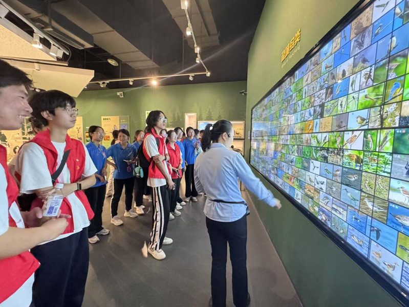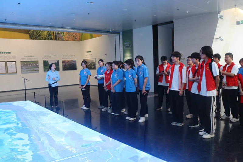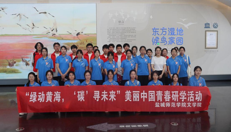 6月26日,文学院“绿索山河,‘碳’寻未来” 实践团依托学校 “生态文明实践基地” 平台,开展实地生态研学活动。实践团首站走进中国黄海湿地博物馆,在讲解员带领下,成员们通过动态数据大屏了解黄海湿地的核心价值,学习候鸟栖息地修复工程中的协同固碳机制;在湿地物种展示区,借助生态标本与全息投影技术观察濒危候鸟迁徙习性及湿地植物碳代谢过程;在“智慧湿地”互动展区,体验无人机巡护、AI 物种识别及碳通量监测等技术设备,深入理解科技对湿地碳汇计量与生态保护的赋能作用。