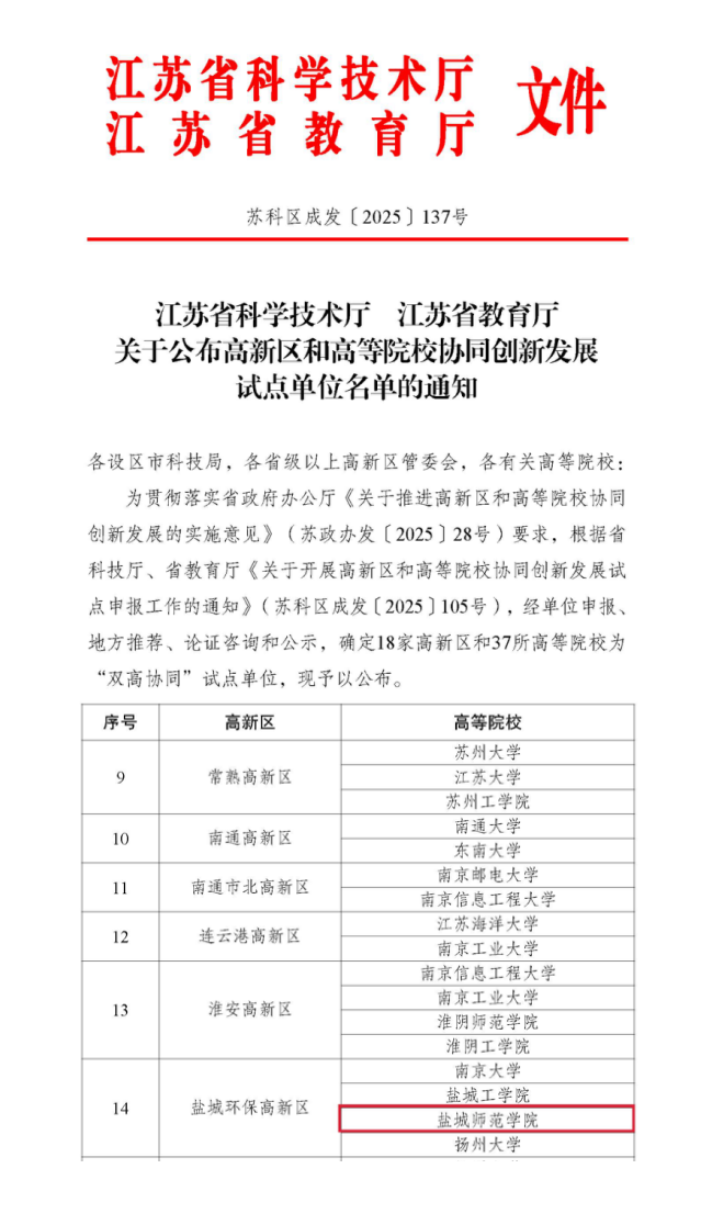 近日,江苏省科技厅、教育厅联合发布《关于公布高新区和高等院校协同创新发展试点单位名单的通知》(苏科区成发〔2025〕137号),公布首批高新区和高等院校协同创新发展试点单位名单。beat365成功入选省“双高协同”创新发展试点单位,与盐城环保高新区开展试点工作。