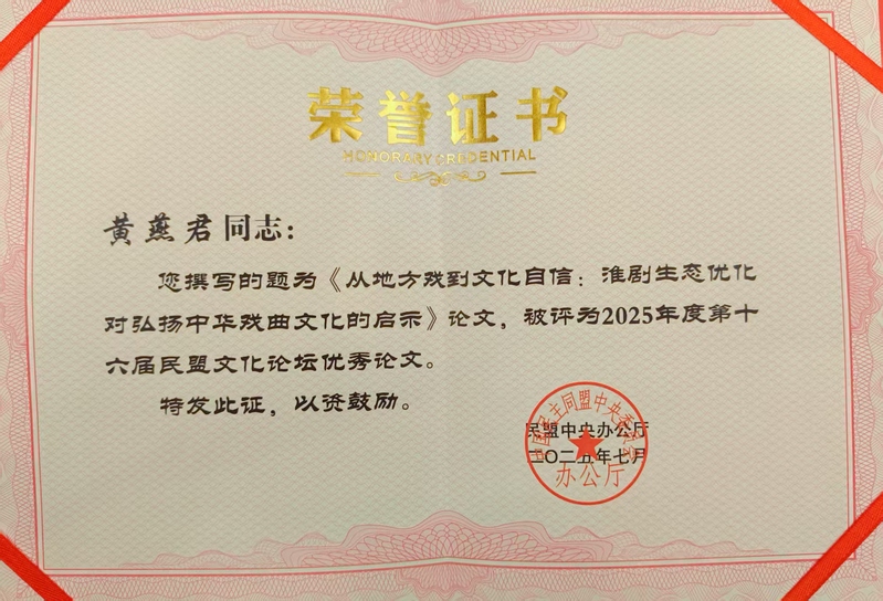 7月17日至18日,以“赓续优秀传统 焕发文化新光”为主题的第十六届民盟文化论坛在上海举办。本次论坛由民盟中央文化委员会、上海社会科学院和民盟上海市委会共同主办。民盟beat365中文登录入口基层委员会盟员、音乐学院教师黄燕君博士的论文《从地方戏到文化自信:淮剧生态优化对弘扬中华戏曲文化的启示》被民盟江苏省委会推选参加本次论坛交流,并被评为论坛优秀论文。