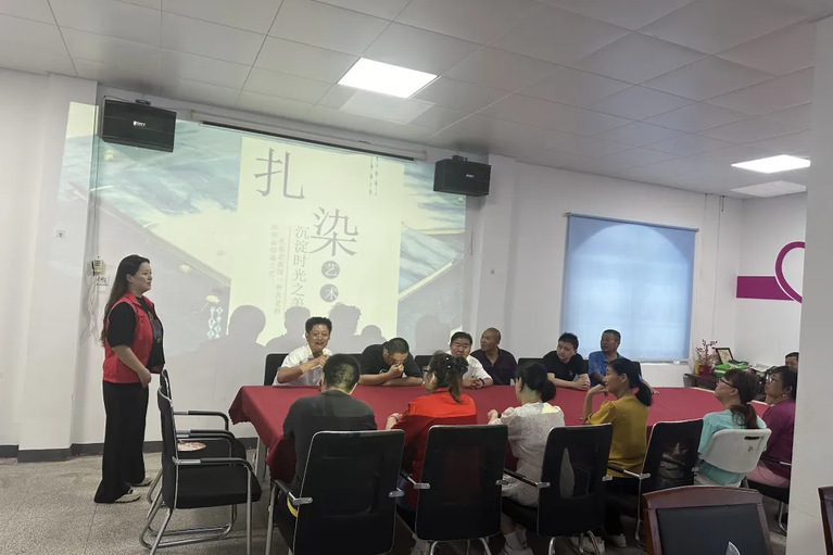 美术师范241班团支部组建的“绘韵承光”社会实践团,走进江苏省常熟市支塘镇残疾人活动中心为残疾人士开展非遗扎染文化传播课程。团队成员高岚和谭可如卉生动讲述扎染千年历程,详解“扎、缝、染、拆”工序,同时细心准备防滑工作台、大字号步骤图等教学工具,设计简化技法让残疾人士在指尖与染料的交融中触摸到传统技艺的温度。在盐城市射阳县合东党群服务中心的公益暑托班中,学院志愿者联合剪纸非遗传承人共同设计“红船精神”“英雄人物”等红色剪纸课程,通过课程设计与心理辅导,帮助孩子们在学习剪纸技巧的同时,感悟红色文化。